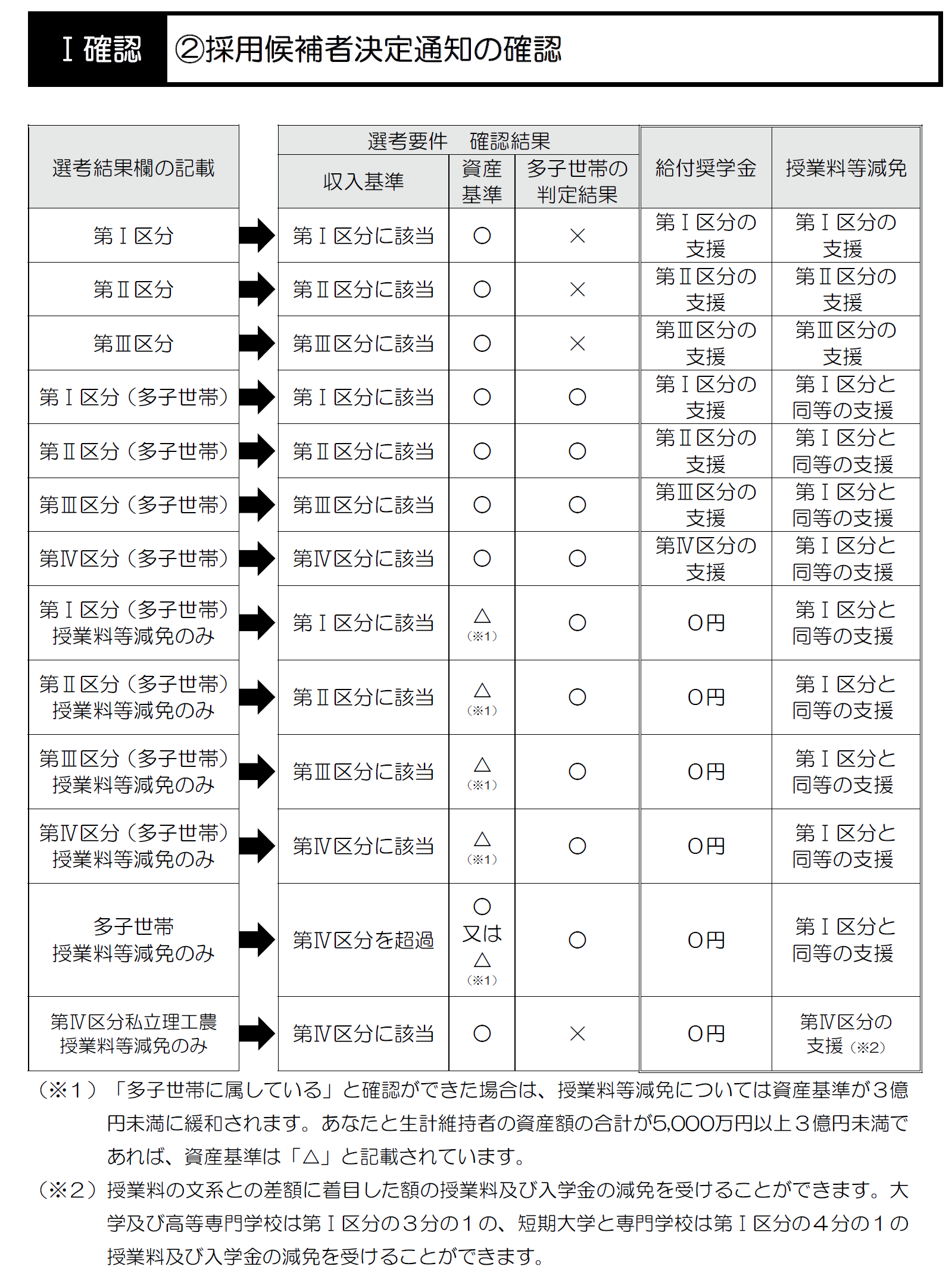 「第一種・第二種のいずれか一方の利用可」:第一種奨学金または第二種奨学金どちらか一方の利用が可能です。進学後の手続きでは、どちらか一方を選択していただく必要があります。